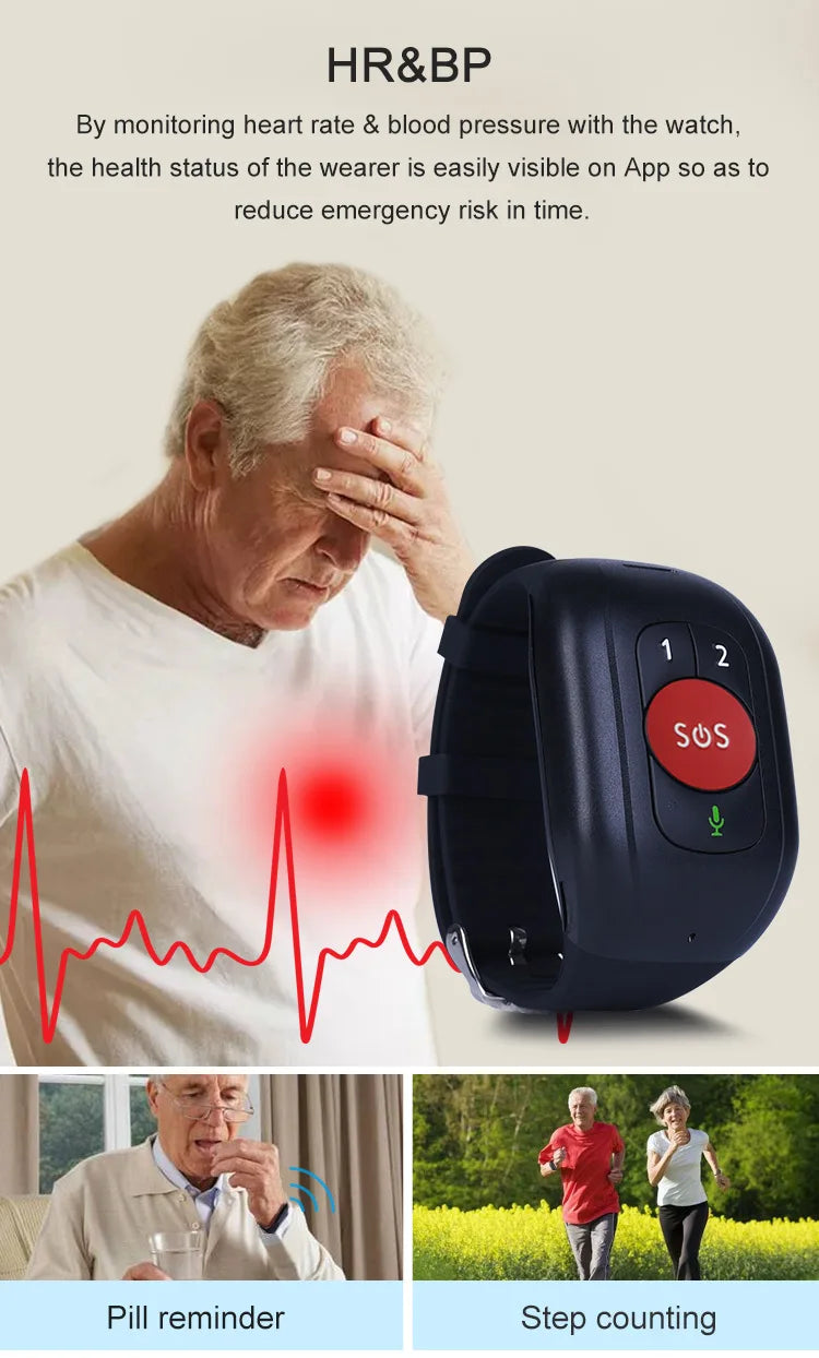 5.one click direct calls /SOS button /fall detection alarm /Heart Rate/Blood Pressure /& oxygen/medicine reminder /steps counting /ringing and vibration notification /take off alarm /body temperature/voice chat /safety zone mode /historical footprint tracker /auto pick up calls /